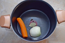 Для варки возьмите удобную, глубокую кастрюлю и сложите в неё очищенные лук и морковь. Резать их не обязательно. Они разварятся при варке. Добавьте в кастрюлю лавровый лист и душистый перец.